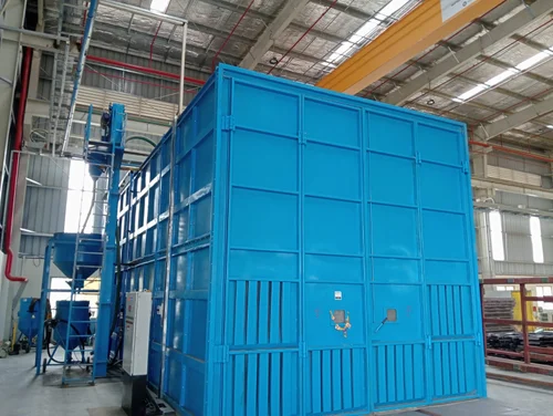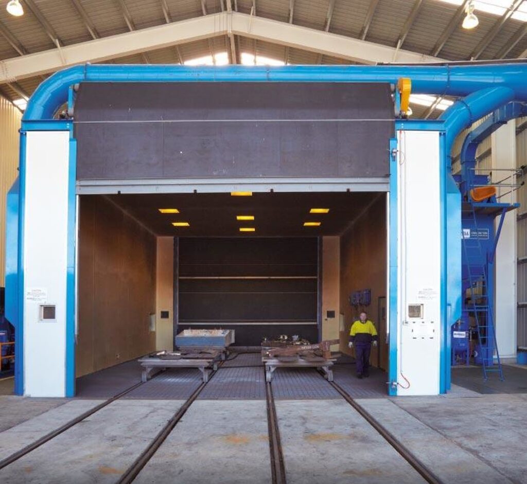 Components are placed inside the blast room using an appropriate handling method such as a trolley, overhead monorail, or forklift. The blasting process is carried out using a pressure-fed or portable blasting machine. The high-velocity abrasive impacts the job surface, removing contaminants like rust, paint, or scale. Spent abrasive falls through the floor grating, where a full-floor network of screw conveyors collects and channels it to the recovery system for separation and reuse. Meanwhile, airborne dust is extracted through the chosen dust collector configuration, ensuring a clean and safe working environment.