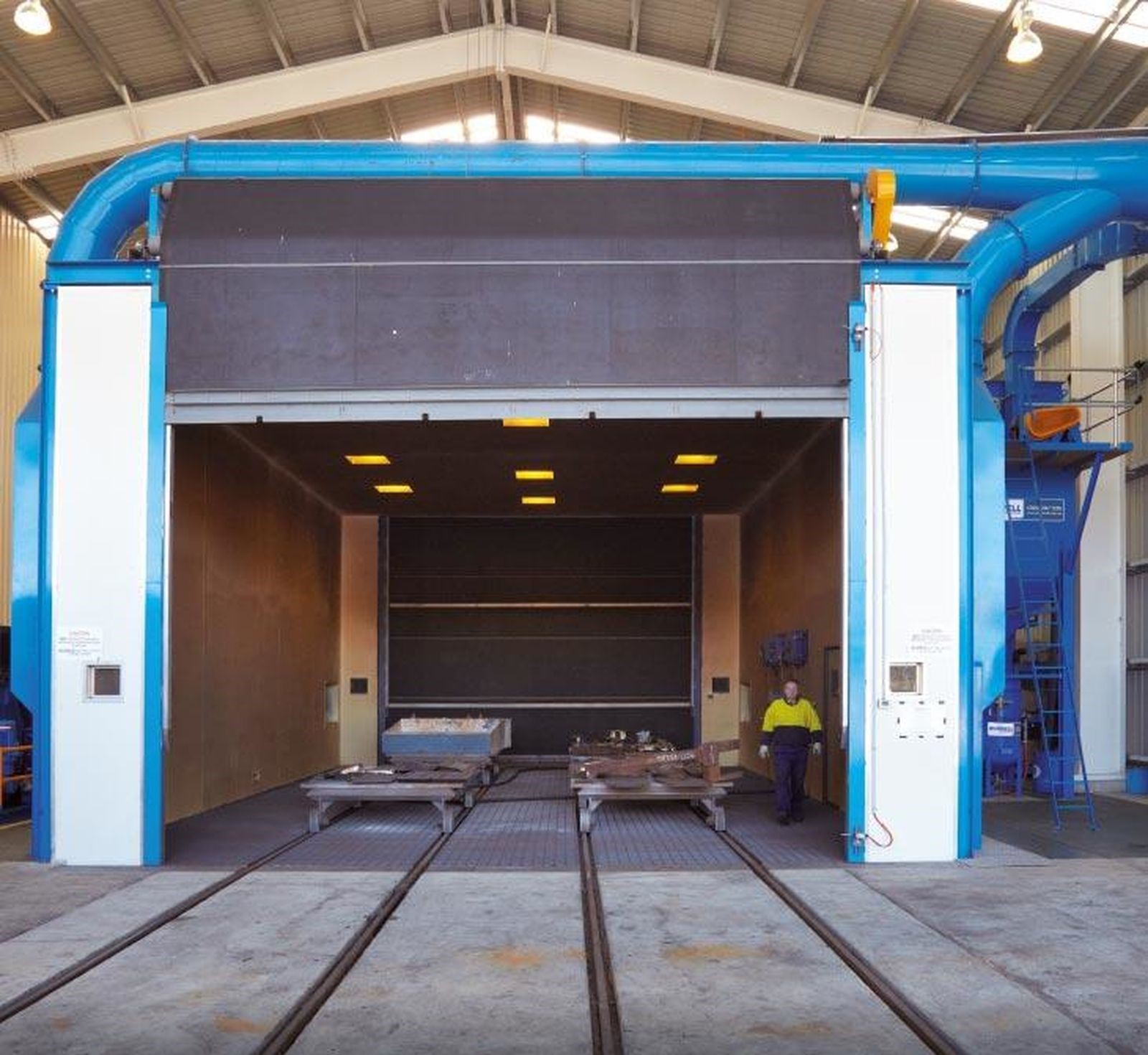 The Blast Room System equipped with a Full Floor Screw Conveyor Recovery System, is a fully integrated solution designed for high-volume industrial surface preparation. This system ensures efficient abrasive recycling, clean air quality, operator safety, and uninterrupted productivity. Built for rigorous applications, it is suitable for large-scale fabrication, heavy equipment maintenance, and high-throughput blasting environments.